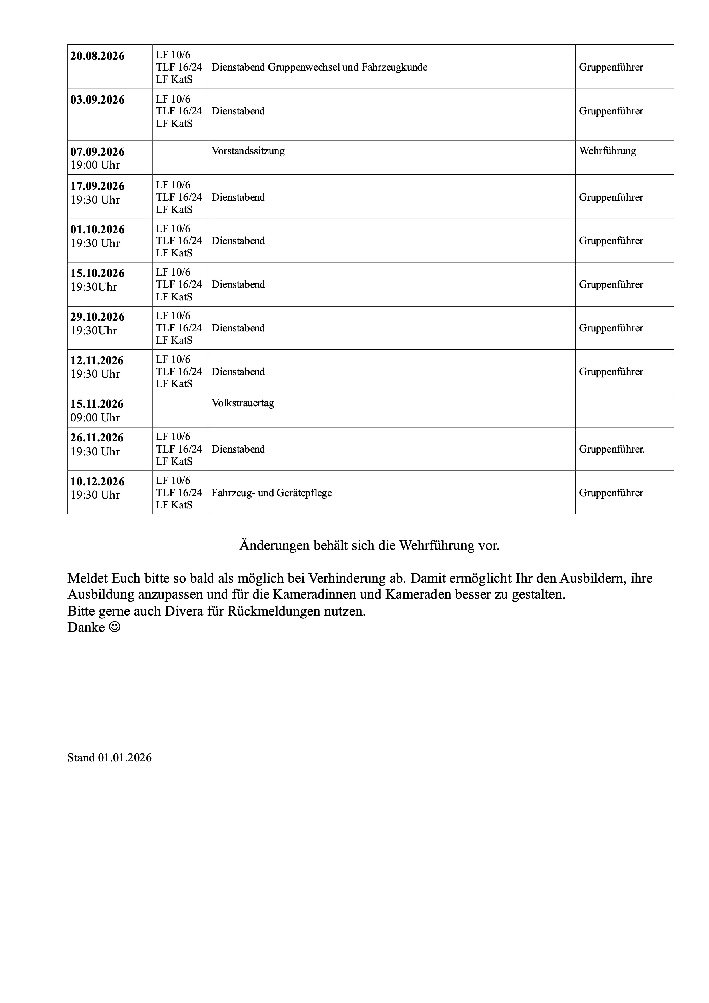 Dienstplan 2026