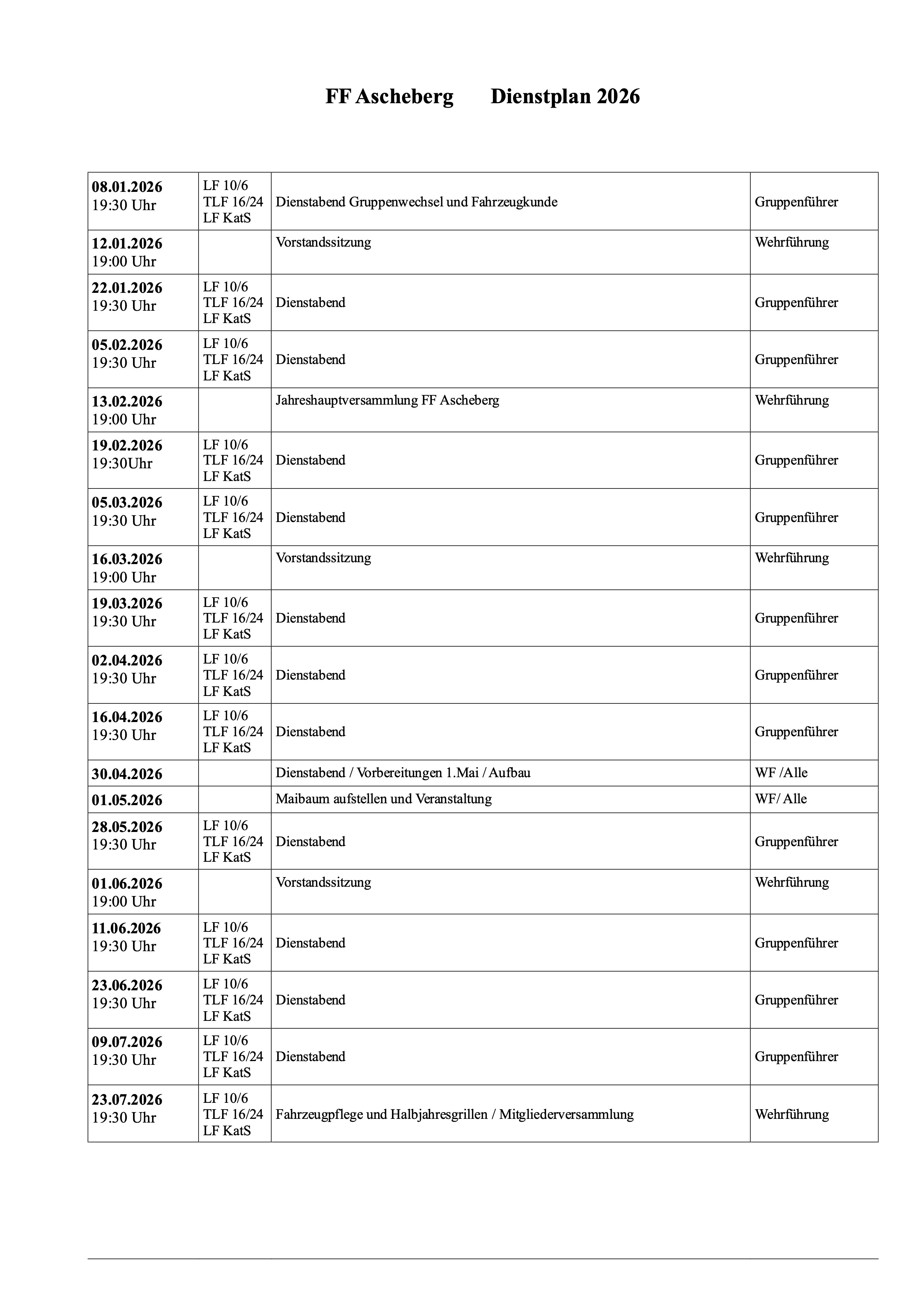 Dienstplan 2026